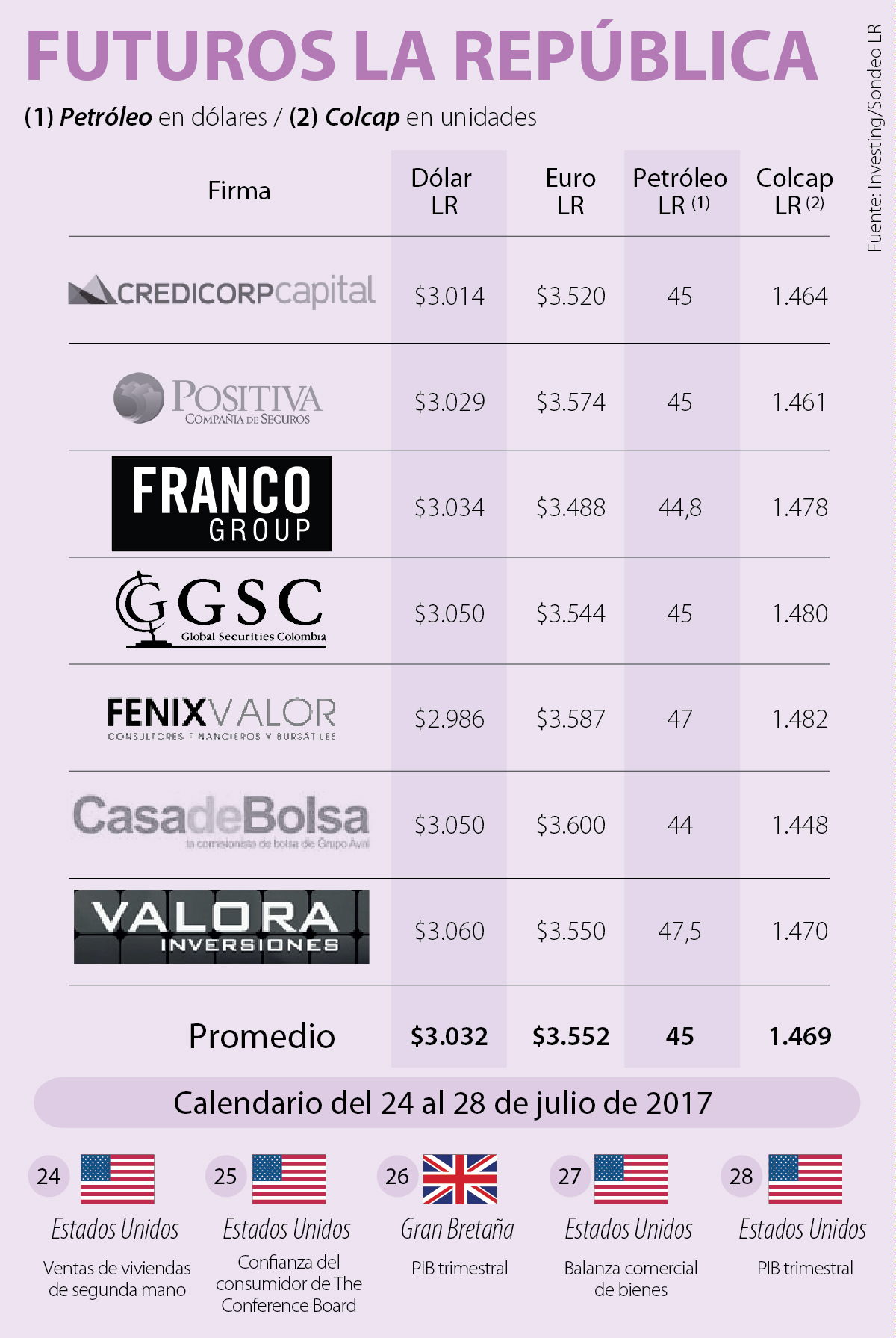 “Durante el fin de semana, se llevará acabo la reunión de algunos miembros del Grupo en Rusia donde se espera que el mensaje sea un poco más alentador, luego de que el jueves la compañía Petro-Logistics estableciera que la producción de julio para el grupo sería la máxima del año. Con un precio del crudo cercano a los US$45 -US$46 por barril, la divisa podría encaminarse una vez más a los $3.050”, indicó Natalia Granados, estratega de Global Securities.