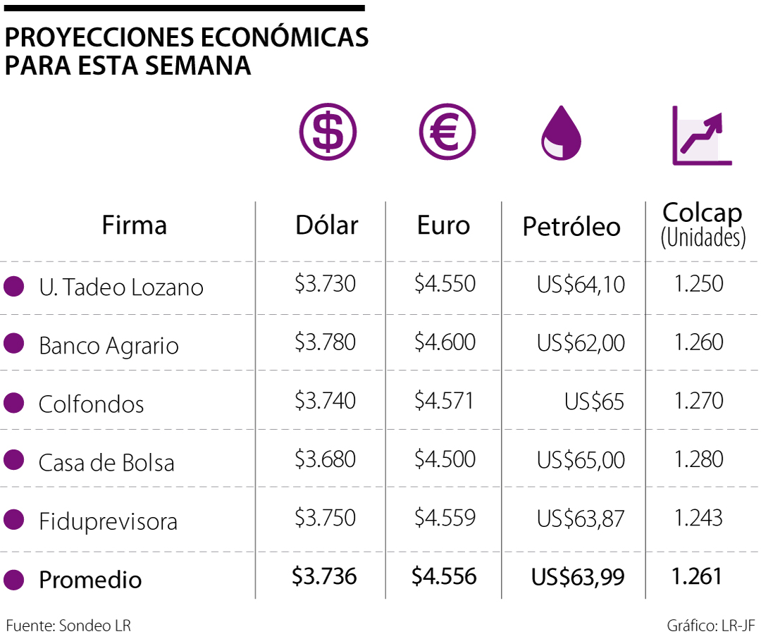 El euro estará en $4.556, mientras que el petróleo WTI llegará a US$63,99 el barril y el Colcap tocará 1.261 puntos