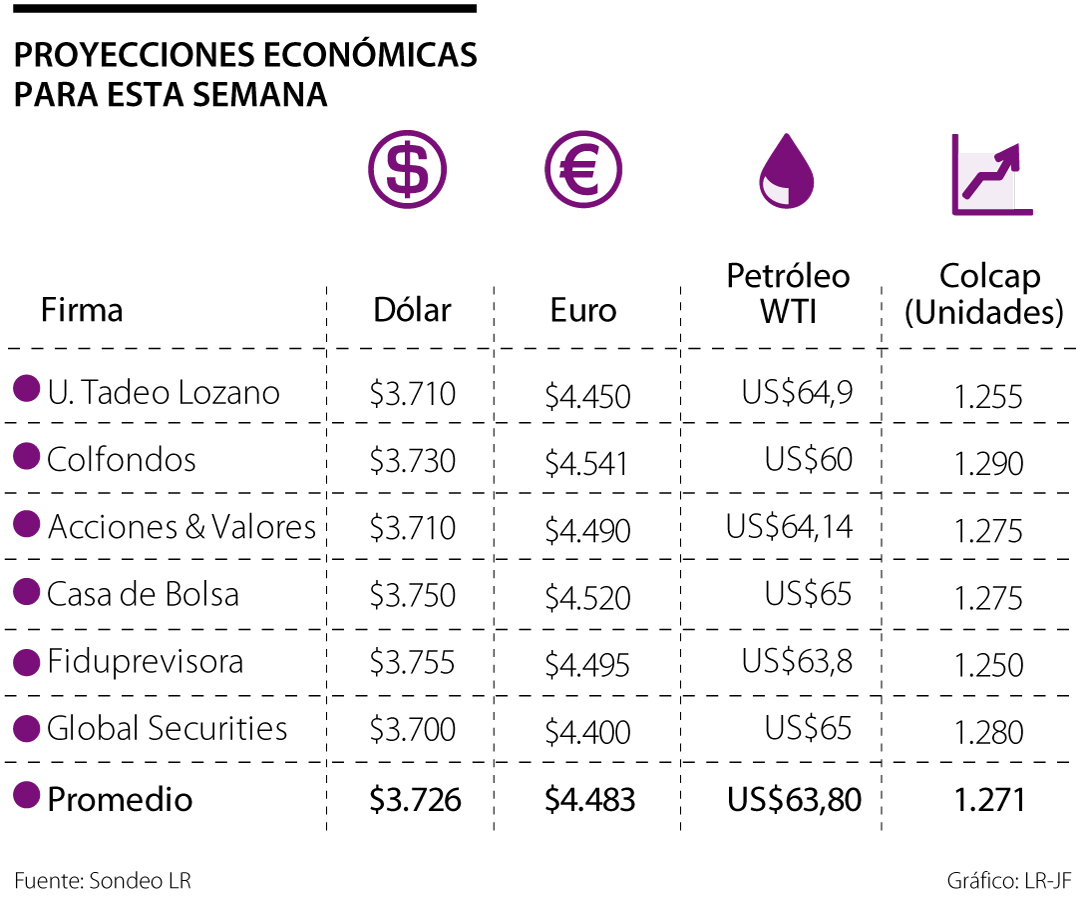 Para esta semana, los analistas proyectan que el dólar se cotice en un promedio de $3.726, mientras que prevén que el barril de petróleo estadounidense WTI se ubique en US$63,80. También esperan que el euro llegue a $4.483, mientras que el Colcap se situaría en 1.271 unidades.