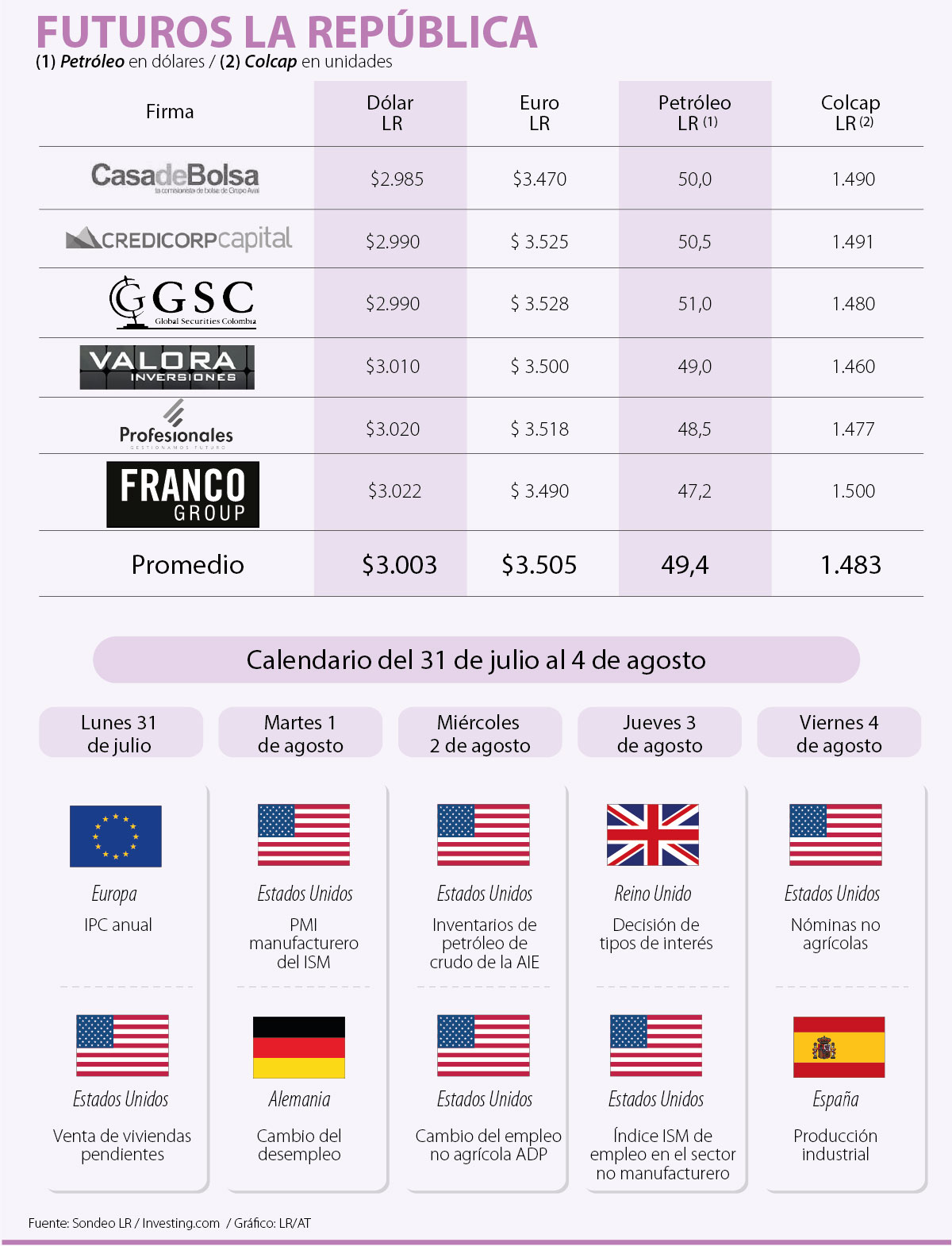 Por el lado de la Bolsa de Valores de Colombia, los analistas aún no creen que el Colcap romperá la barrera de los 1.500 puntos, ya que lo ven en 1.483 unidades. Los inversionistas de la plaza local estarán pendientes de la entrega de resultados correspondientes al segundo trimestre, ya entregaron sus datos Cemex y Nutresa y esta semana lo haría la BVC.
