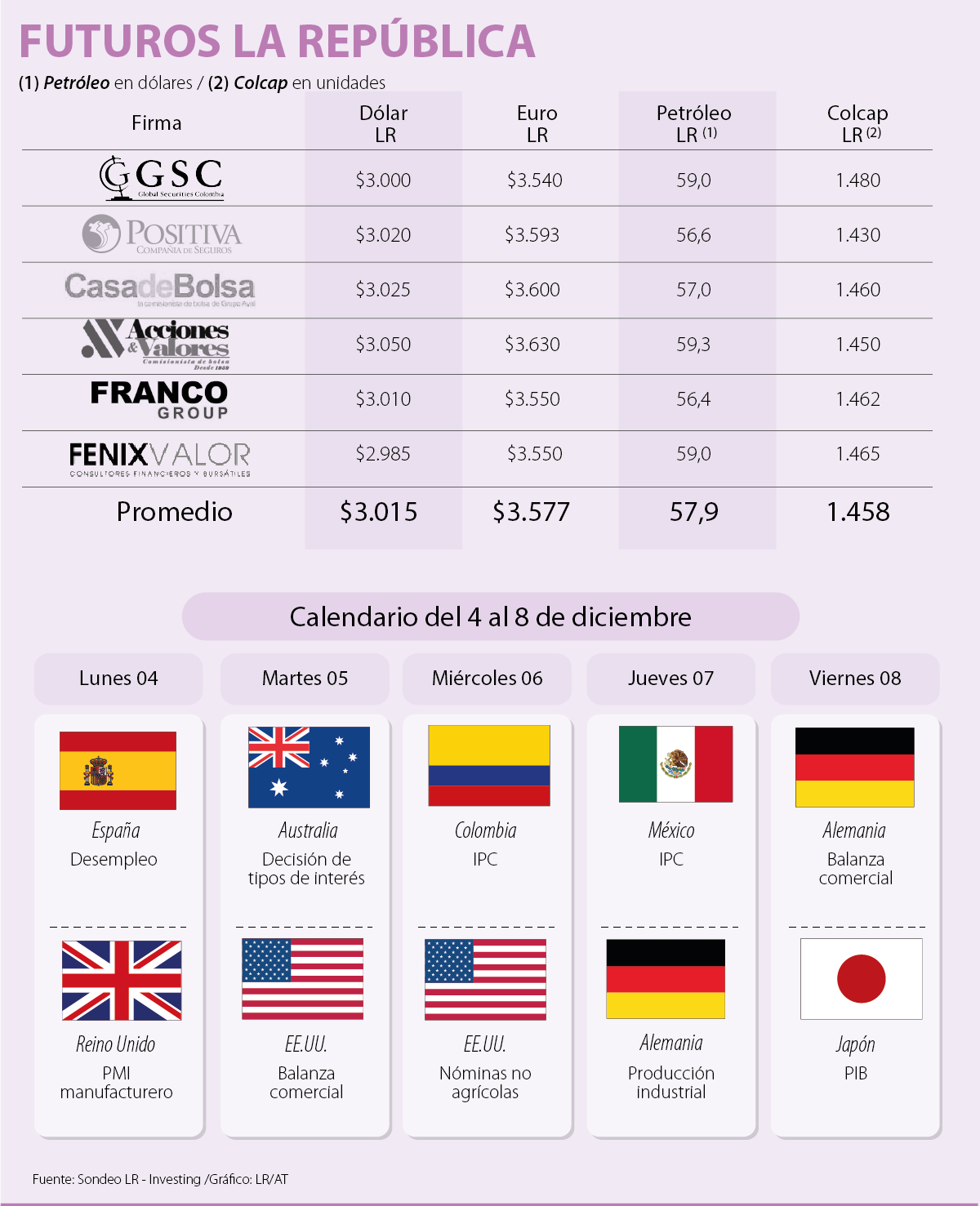 Para el Colcap, se espera una leve subida a 1.458 unidades, aunque esta sería una semana con un bajo volumen de operaciones, por cuenta del festivo de este viernes y de que ya terminó la temporada de resultados corporativos del tercer trimestre.