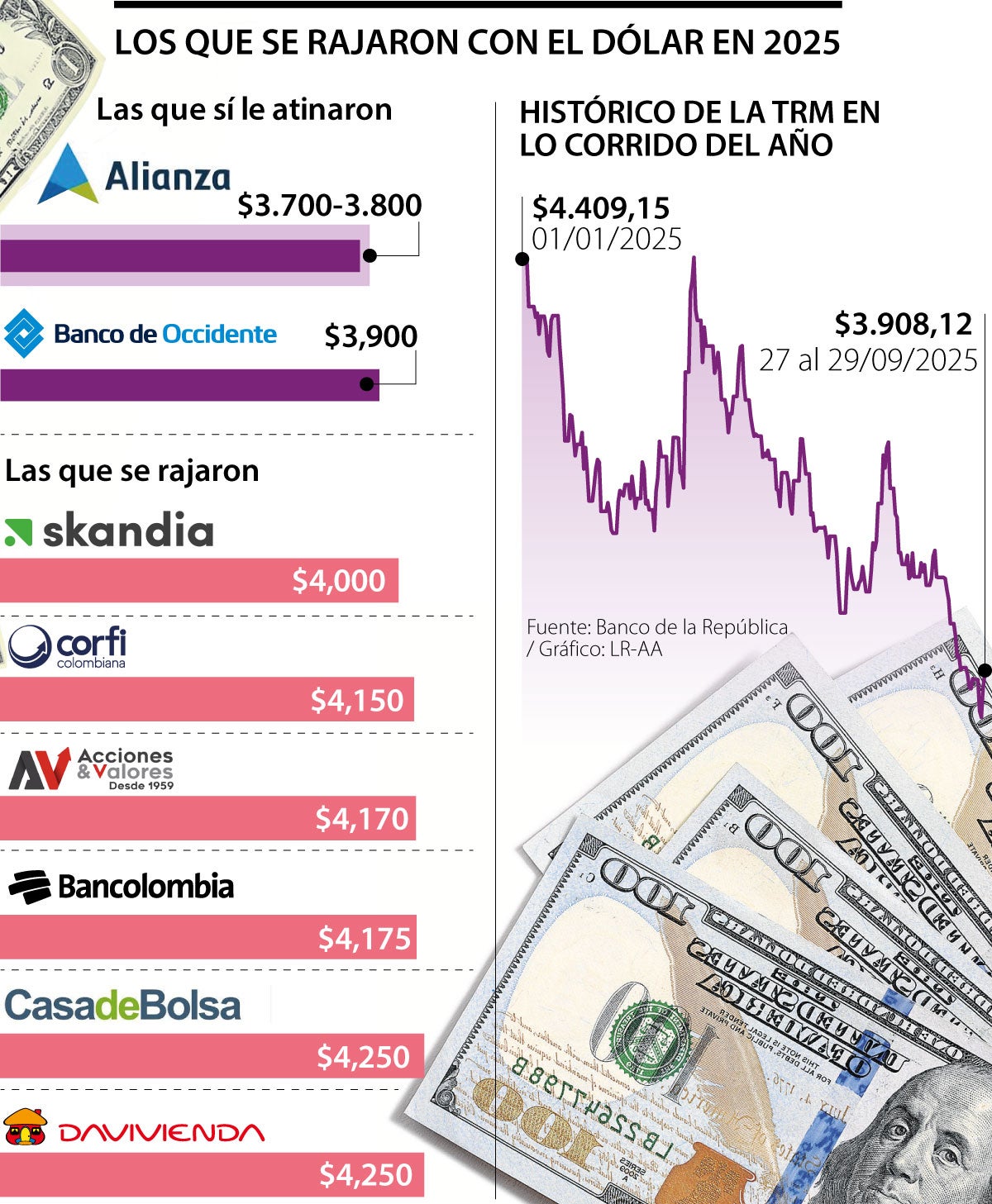 Si bien el debilitamiento del dólar global no sorprende a los analistas, las tradicionales proyecciones que preparan las comisionistas de bolsa y algunos departamentos de investigaciones económicas se ‘rajaron’ en los pronósticos de la tasa de cambio para este año, siendo Alianza y Banco de Occidente una de las cuáles les atinaron.
