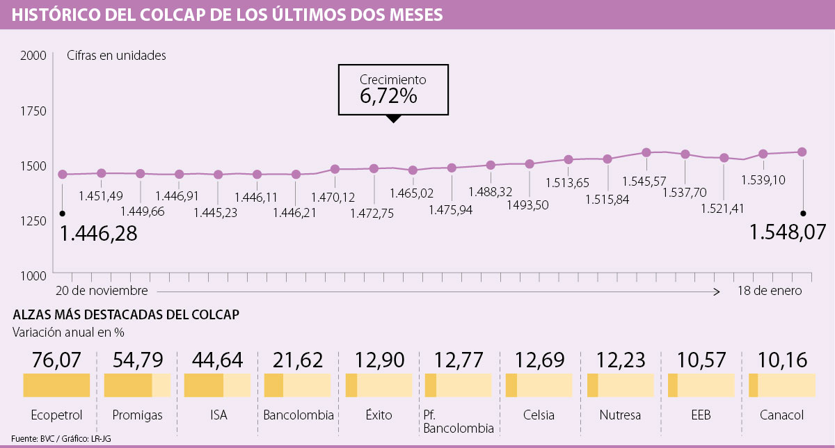 En dos meses, desde el 20 de noviembre pasado, el Colcap ha ganado cerca de 100 puntos, pues pasó de estar en 1.446,28 el 20 de noviembre, a ubicarse en 1.543,54 al cierre del miércoles, lo que representa una valorización de 6,72%, más de la mitad de todo lo que ganó durante 2017.