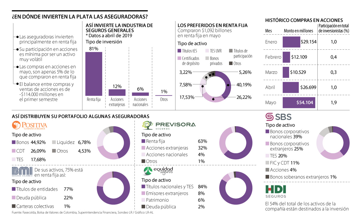 De acuerdo con las cifras registradas por Fasecolda hasta abril de 2019, la industria de seguros generales invierte en renta fija 81% de sus activos destinados a inversión en mercados, mientras que en acciones extranjeras está 12%, en renta variable nacional 6% y en otros vehículos 1%.