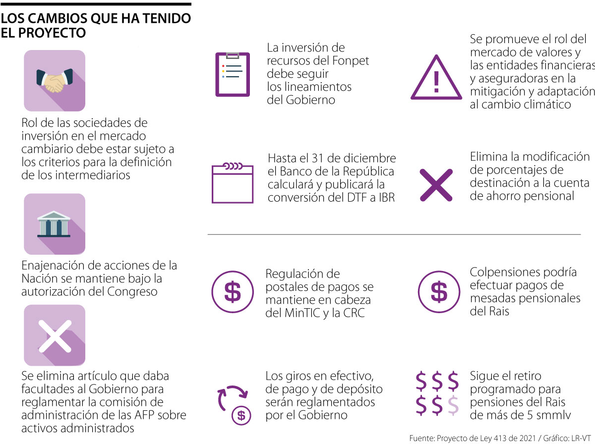Se eliminó el artículo que le daba facultades al Gobierno para reglamentar la comisión de administración de las AFP sobre el valor de los activos gestionados y se determinó que la inversión de recursos del Fondo Nacional de Pensiones de las Entidades Territoriales (Fonpet) debe mantenerse dentro de los lineamientos establecidos por las mismas instituciones centrales, los cuales deberán tener en cuenta dentro de sus objetivos que la inversión de recursos se realice dentro de un marco adecuado de gestión de riesgo.