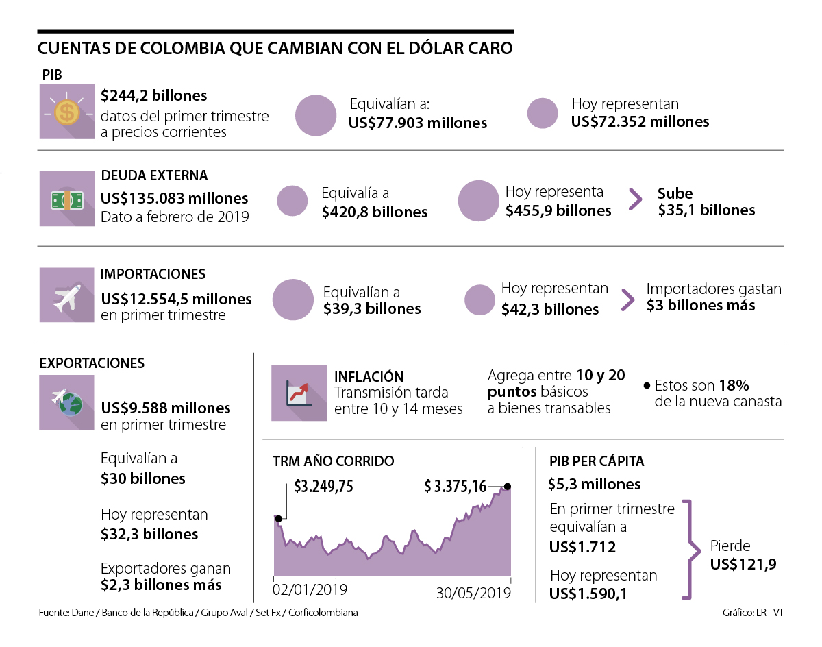 Este encarecimiento, que los analistas atribuyen a los choques externos que recibe la moneda en un periodo de descenso del petróleo, no solo afecta el bolsillo de los colombianos que viajarán al exterior o deben hacer pagos en la divisa, sino a varios indicadores de la economía nacional.