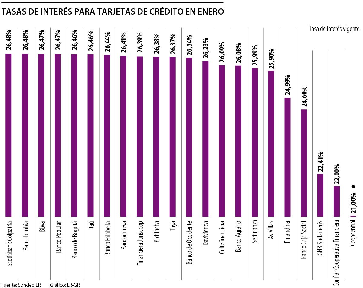 La República consultó las tasas de interés para este producto financiero en las 22 entidades del sistema que lo ofrecen y encontró que los datos más altos corresponden a los bancos Scotiabank Colpatria y Bancolombia, las dos con 26,48%; Bbva y Banco Popular, con 26,47%, y Banco de Bogotá e Itaú (26,46%).