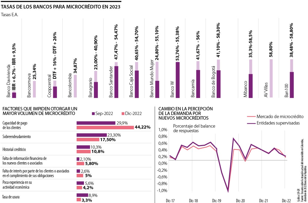 Sin embargo, según el reporte de situación de microcrédito en Colombia, realizado por el Banco de la República, aunque la demanda de microcrédito está en terreno positivo, disminuyó en el último trimestre de 2022, en comparación con el tercer trimestre, en parte por la falta de capacidad de pago de los clientes.