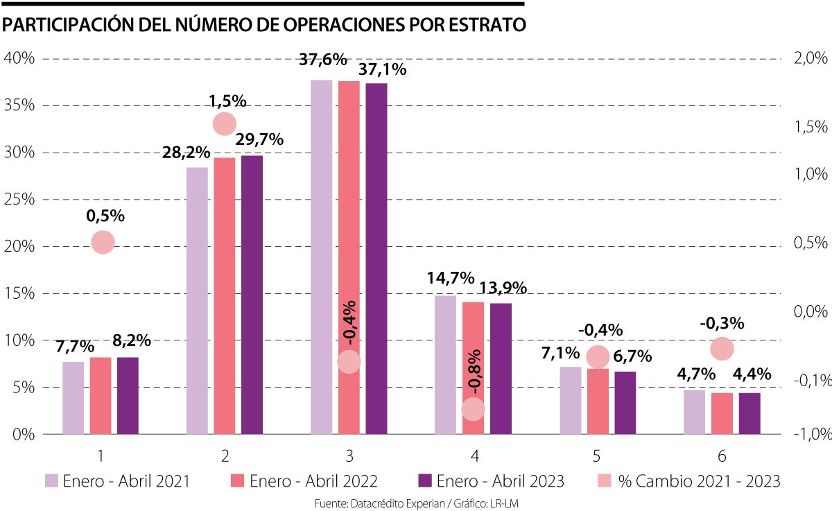Es importante resaltar, a su vez, de este informe, que dos de cada cinco créditos van a estratos uno y dos. En el análisis de las operaciones de crédito por estrato socioeconómico, los estratos dos y tres son los de mayor participación, con 29,7% y 37,1%, respectivamente, para los primeros cuatro meses del año.