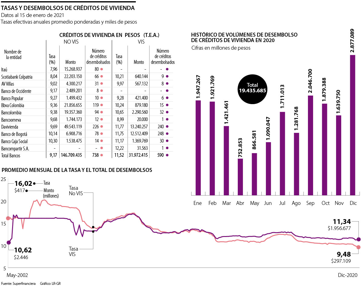 Las tasa del segmento de vivienda no VIS alcanzó un promedio de 9,48% durante diciembre de 2020. Este nivel se convirtió en el más bajo desde mayo de 2002, fecha en la que la tasa para esta línea se ubicó en 16,02%.