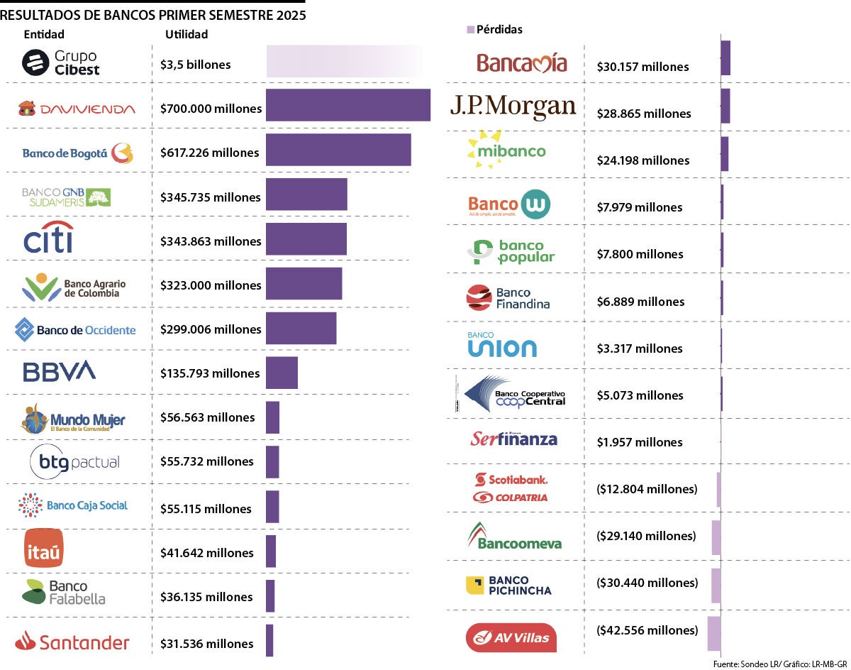 Grupo Cibest, Davivienda y el Banco de Bogotá son los líderes en utilidades para este primer semestre del año, mientras que Pichincha y Bancoomeva tienen las mayores pérdidas