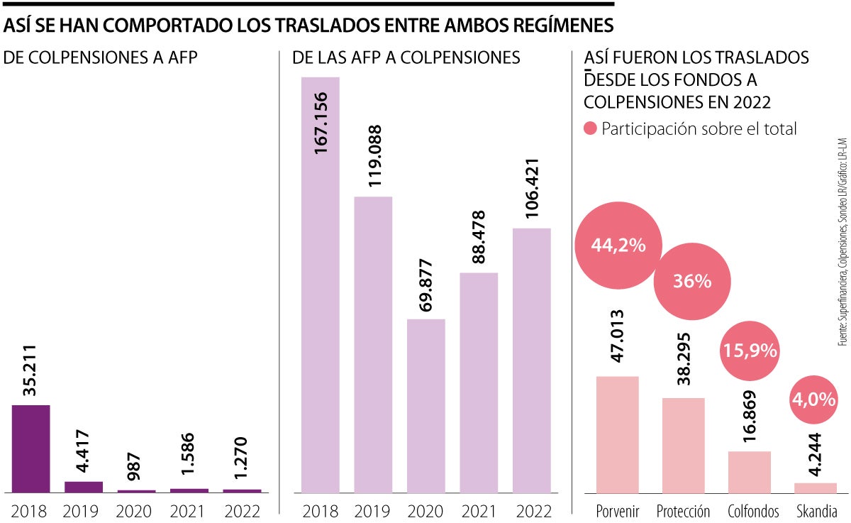 Si se revisan los traslados desde los fondos privados a Colpensiones, de 2018 a 2022 son 551.020 las personas que decidieron cambiar al régimen de prima media (RPM) y la cifra solo para 2022 fue de 106.421 cotizantes.