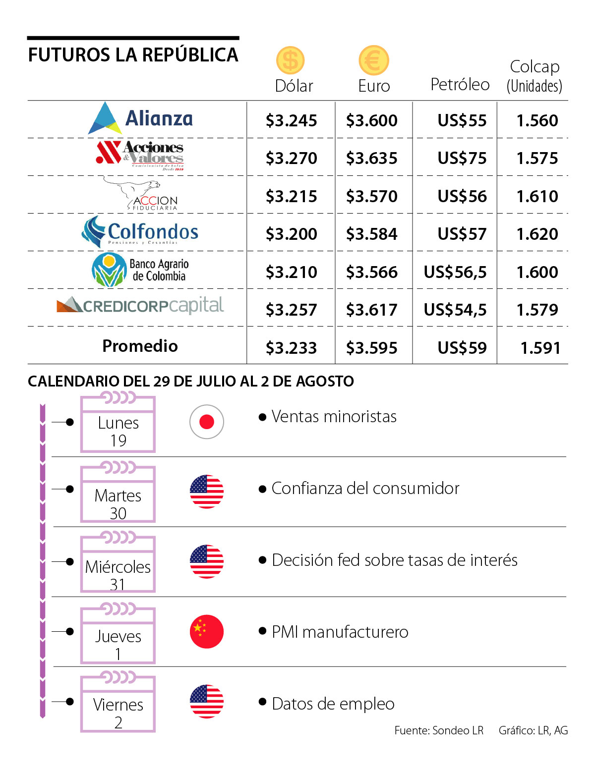 Por otro lado, los analistas consultados proyectaron un euro en promedio a $3.595, un barril de WTI a US$59 y el índice Colcap sobre 1.591 puntos.