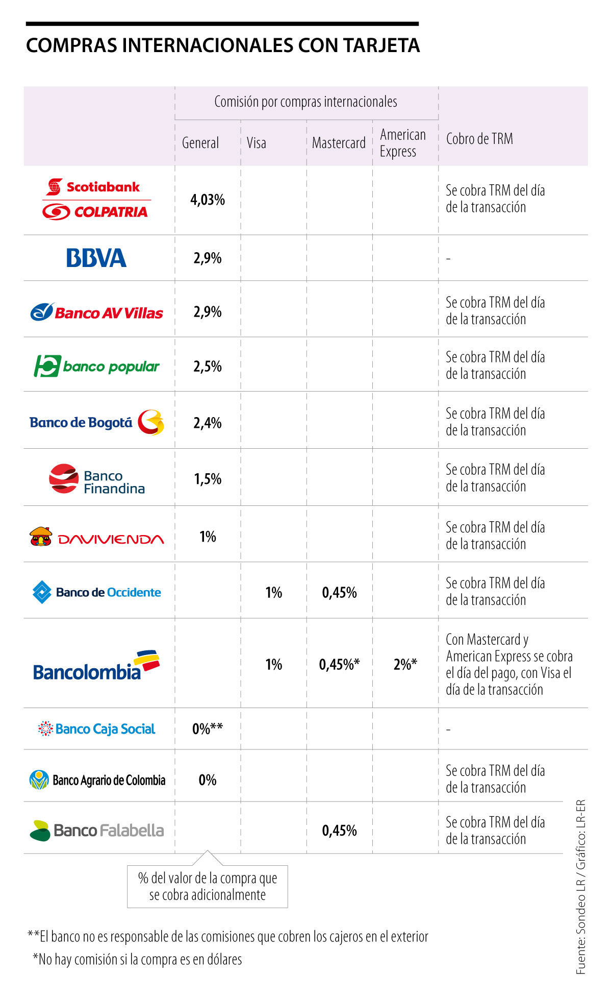 La República indagó entre las diferentes entidades financieras y visitó los portales web de cada una, y encontró que las comisiones más altas las cobra Scotiabank Colpatria (4,03%); Bbva y AV Villas (2,90%), Banco Popular (2,50%) y Banco de Bogotá (2,40%).