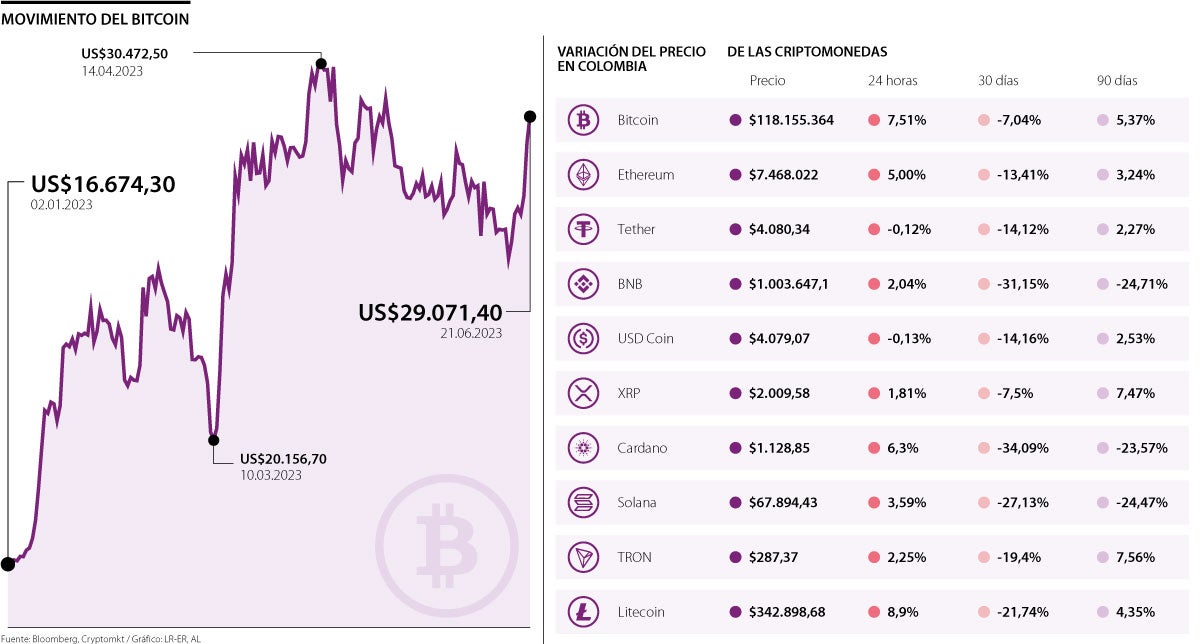 Pero para llegar a una valorización tan alta, la principal criptomoneda del mundo ha pasado por un curva de más de una década, de hecho solo en 2011 un bitcoin logró costar US$1. Ahora la divisa se ha mantenido lo corrido de junio entre US$28.000 y casi US$30.000.