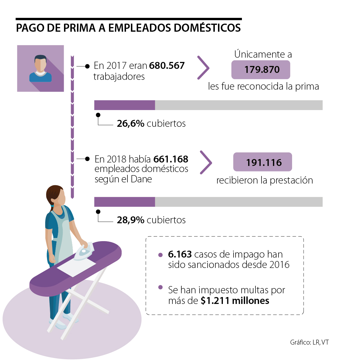 De acuerdo con la Gran Encuesta Integrada de Hogares del Dane, en 2018, de un total de 661.168 empleados de servicio doméstico, solo 191.116 recibieron la prima. Mientras que, en 2017, de 680.567 trabajadores dedicados a esta actividad, únicamente a 179.870 les fue reconocido el pago.