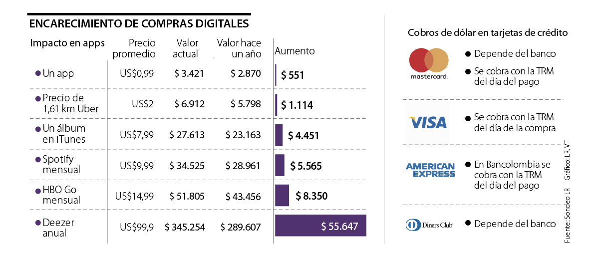 Para un ejemplo más práctico, un viaje en la aplicación Uber, que tiene un costo promedio de US$2 por cada 1,61 km (una milla), sube en un valor aproximado de $1.134. Otras compras comunes que están valoradas en esta divisa son los álbumes de iTunes, cuyo precio actual está en US$7,99, y aumenta en promedio $4.451. Hace un año estaba en $23.163, y hoy cuesta $27,613.