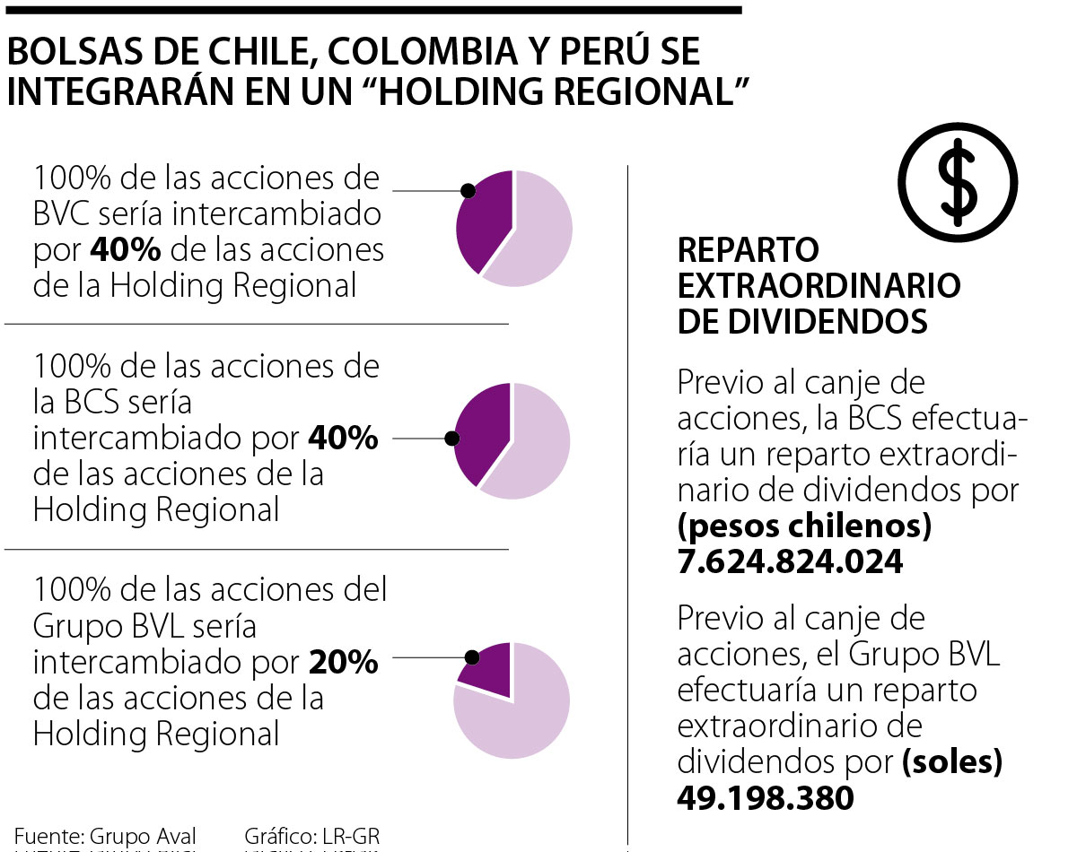 “En caso de lograrse la concurrencia de 100% de los accionistas de cada entidad, la Holding Regional se compondría, en una relación 40%/40%/20%, por accionistas de la BCS, de la BVC y del Grupo BVL, respectivamente”, explican en el informe.