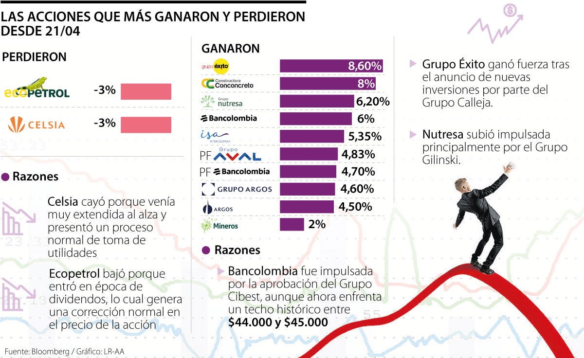 En la semana del lunes 21 al viernes 25 de abril, las acciones del Grupo Éxito se destacaron como las de mayor valorización en la Bolsa de Valores de Colombia, con un aumento de 8,6%. Le siguieron Conconcreto con un incremento de 8%, Nutresa con 6,2% y Bancolombia con 6%. También mostraron buenos desempeños ISA (5,35%), PF Grupo Aval (4,83%), PF Bancolombia (4,7%), Grupo Argos (4,6%) y Cemargos (4,5%).