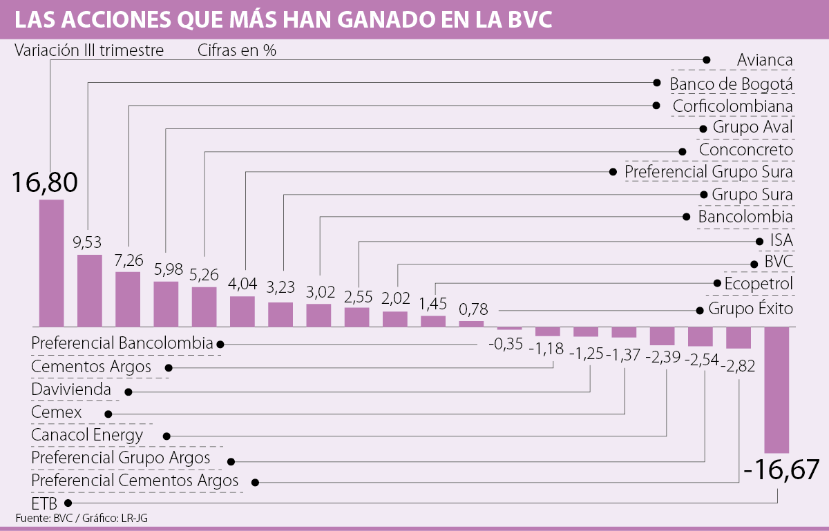 Otra de las empresas que también tuvo un importante ascenso entre julio y septiembre fue la acción del Banco de Bogotá, la cual tuvo una variación positiva de 9,53% en el trimestre. Cabe mencionar que en la jornada de ayer, esta especie subió 0,70% y cerró el día en $68.980.