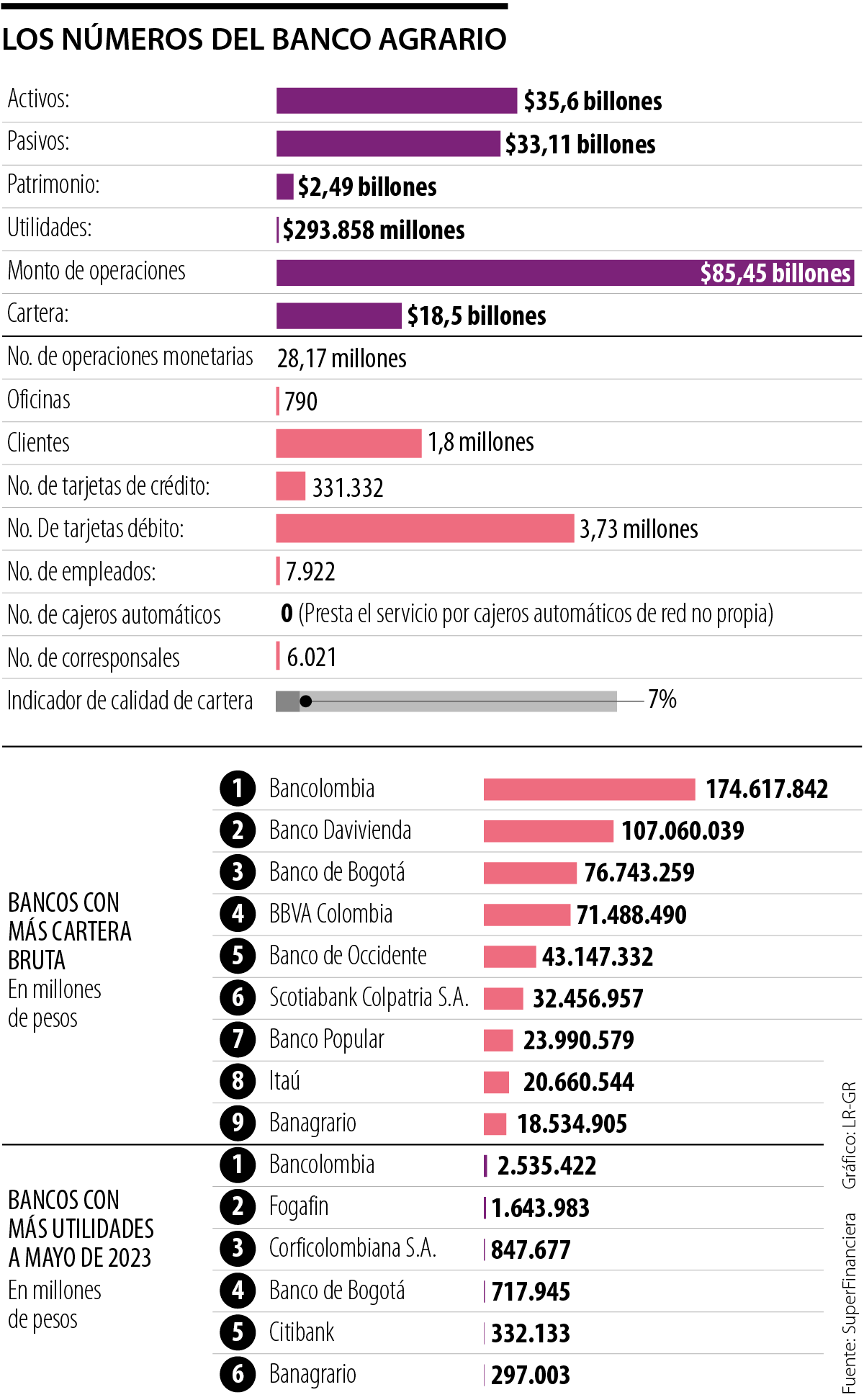 Entre otras cifras, el Banco Agrario, controlado por el Ministerio de Hacienda, cuenta con 790 oficinas, 1,8 millones de clientes, 331.332 tarjetas de crédito, 3,73 millones de tarjetas débito, $35,6 billones en activos, $33,11 billones en pasivos, $2,49 billones de patrimonio y $293.858 millones de utilidades.