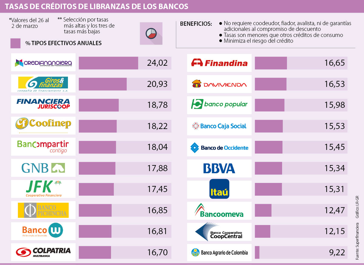 Ahora, según el más reciente informe de la Superintendencia Financiera (con valores correspondientes entre el 26 de febrero y 2 de marzo) Banco Agrario, Coopcentral, Coomeva, Serfinanza y Banco de Bogotá son las cinco entidades que ofrecen mejores tasas en los créditos de libranza, ya que tienen tipos de 9,22%, 12,15%, 12,47%, 13,35% y 14,63%; respectivamente.