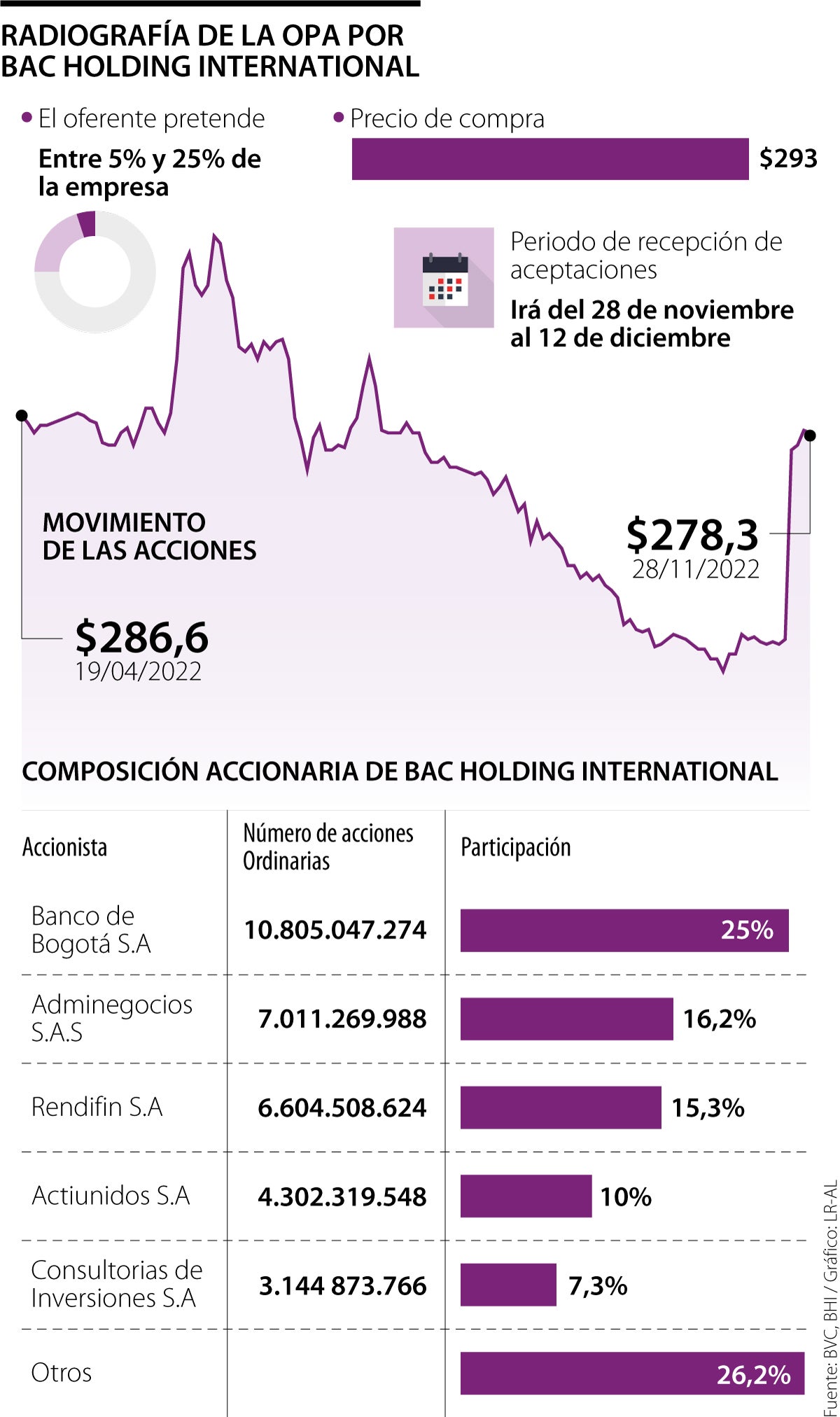 BAC Holding International nació en 2022 de la división entre Banco de Bogotá y Grupo Aval. Luis Carlos Sarmiento Angulo lanzó una Oferta Pública de Adquisición en mayo por BHI, a través de Rendifin, dueña de 3,6% del Grupo Aval. El oferente logró 72,04% del máximo de la OPA, es decir, 10,8% de las acciones en circulación. El precio que pagó por cada título fue de $293, por lo que el monto que desembolsó fue de $1,11 billones. La OPA buscaba entre 5% y 15% de las acciones en circulación.
