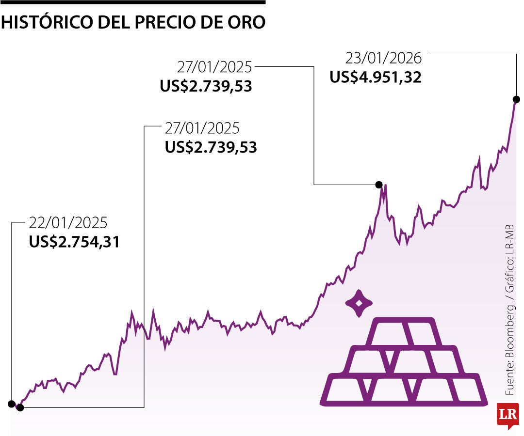 El oro alcanzó un precio histórico superior a los US$4.960 en las primeras operaciones y se encamina a una ganancia semanal de más de 7%