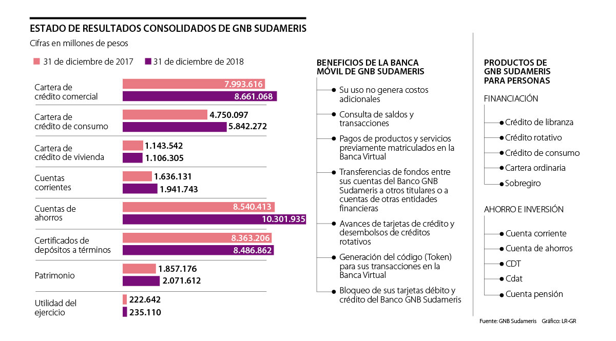Al revisar el estado de resultados consolidados del banco GNB Sudameris, los productos estrella son las cuentas de ahorro y la cartera de crédito comercial. El primer servicio registraba al 31 de diciembre del año pasado $10,3 billones; mientras que el segundo tenía $8,6 billones. Posteriormente estaban los certificados de depósitos a términos (CDT), con un monto de $8,4 billones. Por otro lado, el patrimonio se contabilizaba en $2,07 billones, un alza frente a 2017, cuando este rubro significaba $1,85 billones. Con base en su ejercicio el año anterior, la utilidad del banco se ubicó en $235.110 millones.