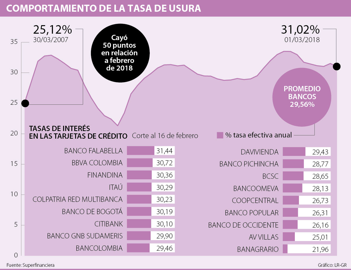 Para tener un contexto más amplio, hace un año, entre enero y marzo de 2017, la tasa de usura se ubicó en 33,51% lo que significó una baja de 2,49 puntos porcentuales; siguiendo también la tenencia que ha marcado el Banco de la República con la baja de tipos de 7% a 4,5% en el mismo periodo.