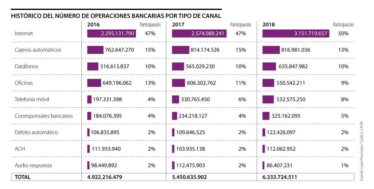 La tendencia entre las entidades bancarias es innovar en herramientas que permitan hacer transacciones por medios digitales, lo que reduce tiempos y costos. La apuesta por el canal en línea ha sido tal que, según el informe de operaciones de la Superintendencia Financiera de 2018, el año pasado, por primera vez, el número de operaciones y el monto de las transacciones monetarias realizadas por internet fueron superiores a las que se hicieron en las oficinas de las instituciones.