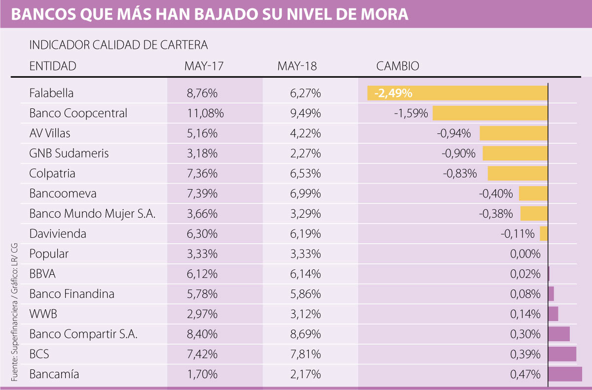 Los bancos Falabella, Coopcentral y AV Villas son los que más bajaron su nivel de mora en este segmento según las cifras reportadas a la Superintendencia Financiera y ya se ubican en niveles de 6,27%, 9,49% y 4,22%, respectivamente.