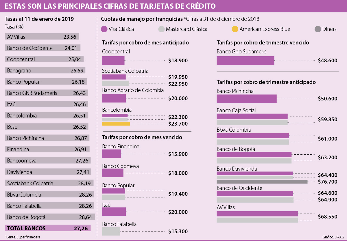 Al analizar los últimos datos entregados por la Superfinanciera, con corte a 31 de diciembre de 2018, Banco Falabella y Banco Finandina cuentan con las cuotas de manejo más bajas al segmentar por mes vencido, ya que tienen cobros de $15.300 en la Mastercard clásica y $15.900 en la Visa Clásica, respectivamente. Pero al analizar los bancos que hacen los cobros mes anticipado, Coopcentral ($18.900) y Scotiabank Colpatria ($19.950) se llevan el liderado de tarifas más baratas. Al revisar las cuotas por trimestre anticipado, los más bajos los tiene Pichincha ($50.600) y le sigue Caja Social ($59.859).