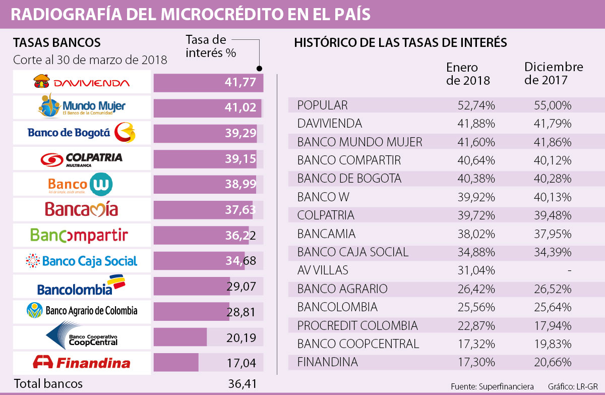 Ahora, sobre los bancos que lideran, según Luis Enrique Dussán, presidente del Banco Agrario, “las tasas son competitivas debido a que en las actividades agropecuarias los márgenes de rentabilidad son bajos, como resultado de: falta de cobertura, asistencia técnica, disminución de sus productividades, canales de comercialización inadecuados, así como de los riesgos inherentes a su actividad, por esto para el Banco es importante atender a los microempresarios ya que a través del financiamiento, se logra el fortalecimiento de sus proyectos productivos, mejorando la calidad de vida de las familias del sector rural”.