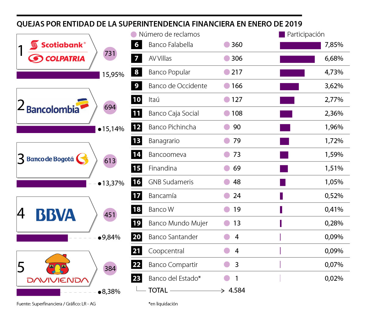 De acuerdo con las cifras publicadas por la Superfinanciera, en enero de este año, los bancos que registraron mayor cantidad de quejas fueron Scotiabank Colpatria con 731, que son 15,95% del total de los reclamos del mes; Bancolombia, que con 694 tiene 15,14% del total de las quejas; Banco de Bogotá, que registró 613 quejas (13,37% de la participación); Bbva Colombia, que alcanzó 451 (9,84% del total), y Davivienda, con 384.