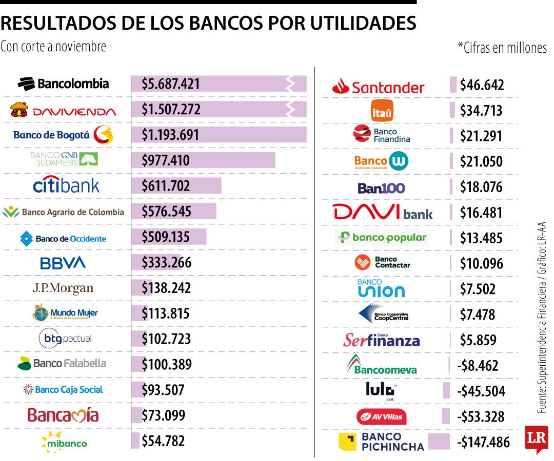 Entre las entidades con cifras positivas también están Citibank ($611.702 millones); Banagrario ($576.545 millones); Banco de Occidente ($509.135 millones); y Bbva Colombia ($333.266 millones).