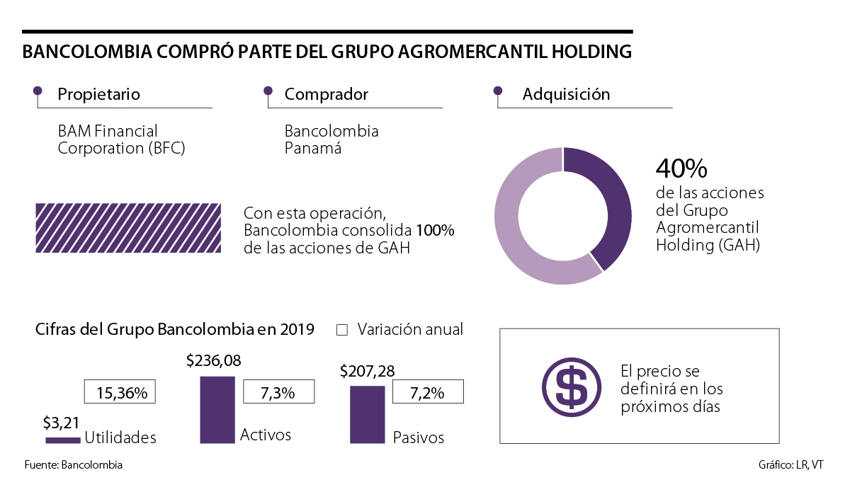 A través de un comunicado publicado en la Superintendencia Financiera, Bancolombia anunció que ya recibió una comunicación de parte de BAM Financial Corporation (BFC), sociedad propietaria en 40% de las acciones del Grupo Agromercantil Holding (GAH) en Guatemala, en la que notificó la decisión de ejercer una opción contractual de compra establecida en su favor, para la venta de la totalidad de su participación accionaria en GAH, a la filial Bancolombia Panamá.