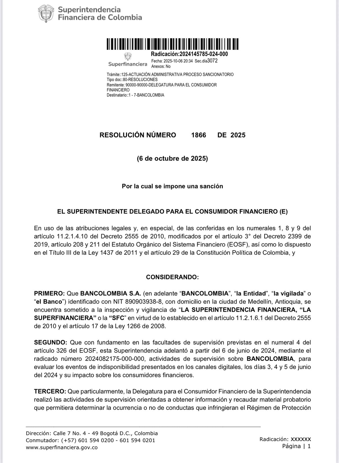 "Particularmente, la Delegatura para el Consumidor Financiero de la Superfinanciera, realizó las actividades de supervisión orientadas a obtener información y recaudar material probatorio que permitiera determinar la ocurrencia o no de conductas que infringieran el Régimen de Protección", se lee en la resolución 1866 de 2025 de la entidad.