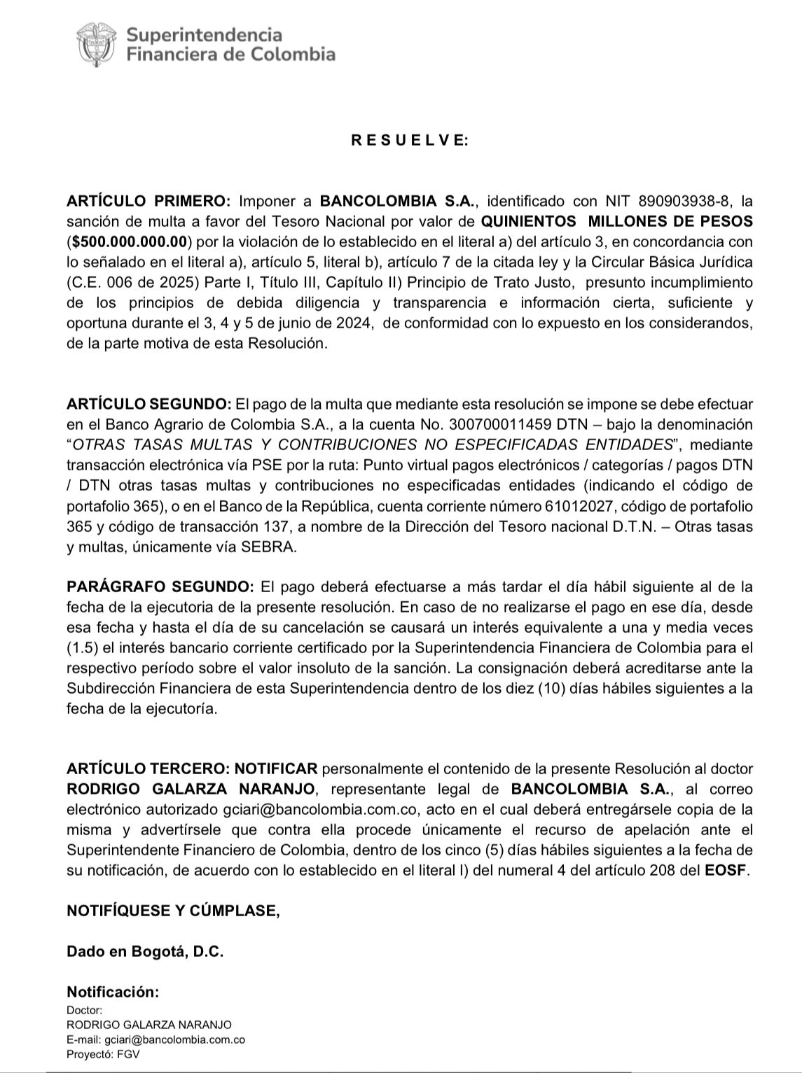 La Superintendencia Financiera aseguró que Bancolombia fue multado con $500 millones por las intermitencias en los sistemas digitales del pasado 3, 4 y 5 de junio de 2024. El ente regulador encontró que las fallas tuvieron un impacto significativo en los consumidores financieros.