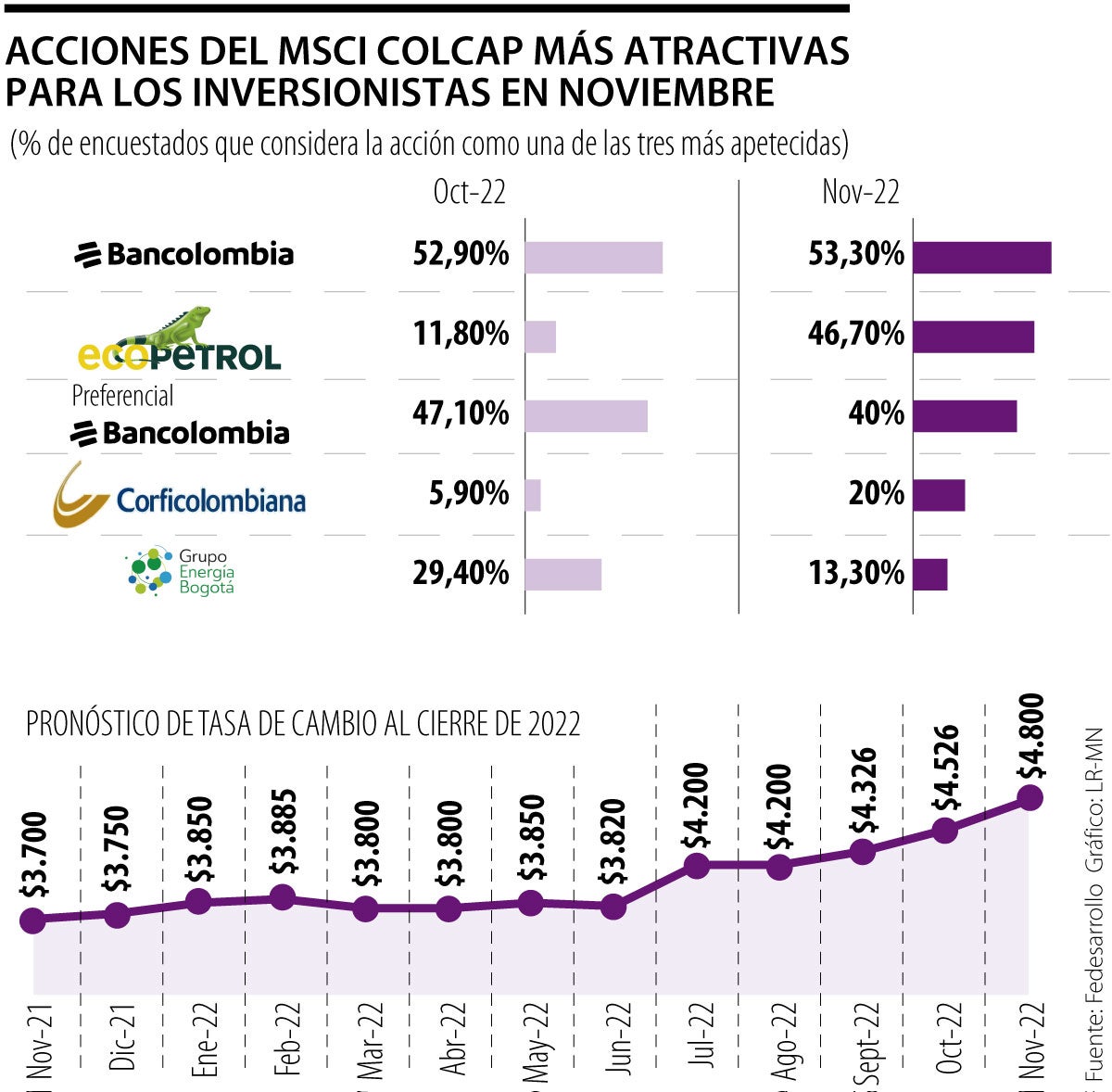 La última Encuesta de Opinión Financiera (EOF) de Fedesarrollo reveló que las tres acciones más atractivas dentro de las que componen el índice Msci Colcap son Bancolombia, con 53,3% de los analistas consultados, seguida de Ecopetrol (46,7%) y la especie preferencial de Bancolombia (40%).