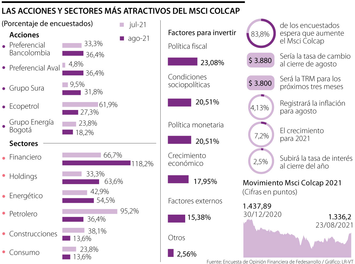 Según el sondeo de Fedesarrollo, 83,8% de los analistas espera que el índice bursátil Msci Colcap, de la Bolsa de Valores de Colombia (BVC), se valorice en los próximos tres meses. Más de 16% de los encuestados espera que caiga y ningún experto prevé que se mantenga inalterado. Este indicador ha aumentado 10,97% durante el último año, mientras que en lo que va de 2021 ha perdido 7,02%. Si se mira el primer semestre, cayó 13,14% y en lo que va de la segunda mitad de año, se ha recuperado 7%. Durante los 23 días de agosto ha ascendido 8,11%, luego de que ayer cerrara a 1.336,2 puntos.