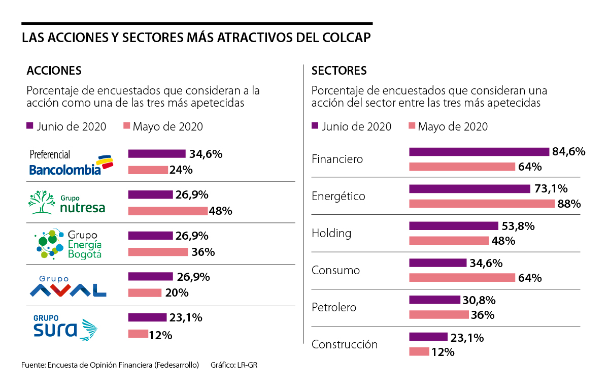 En cuanto a Nutresa, GEB y Grupo Aval, 29,6% de los analistas que participaron en la EOF señalaron que estas estaban entre las tres acciones más atractivas para el sexto mes del año. En mayo, los porcentajes de los encuestados que las incluyeron en el top tres fueron 48%, 36% y 20% respectivamente.