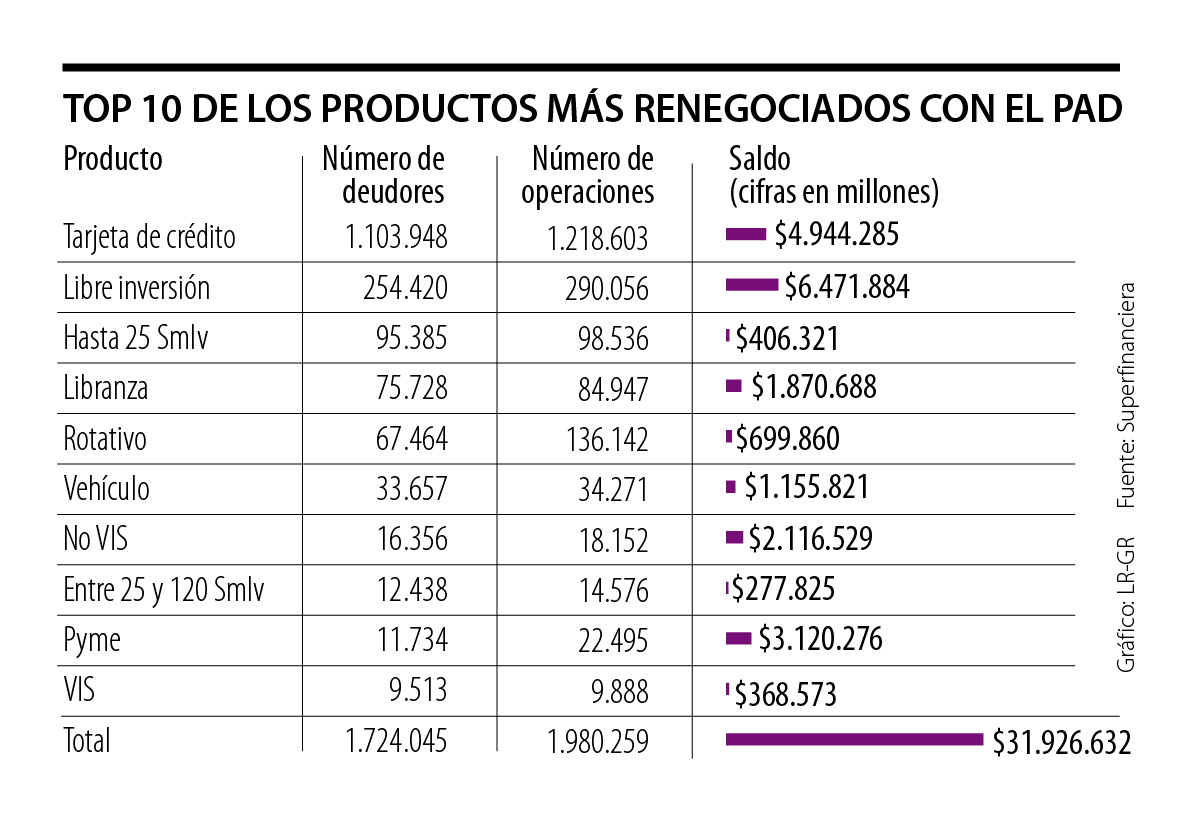 Mediante el Programa de Acompañamiento a Deudores (PAD), la Superintendencia Financiera más de 1,72 millones de deudores redefinieron sus créditos por $31,9 billones al 2 de diciembre de 2020. Las tarjetas de crédito, los créditos de libranza y los de hasta 25 salarios mínimos fueron los productos que más recibieron peticiones de renegociaciones, con 1,1 millones, 254.420 y 95.385 deudores acogidos, respectivamente.