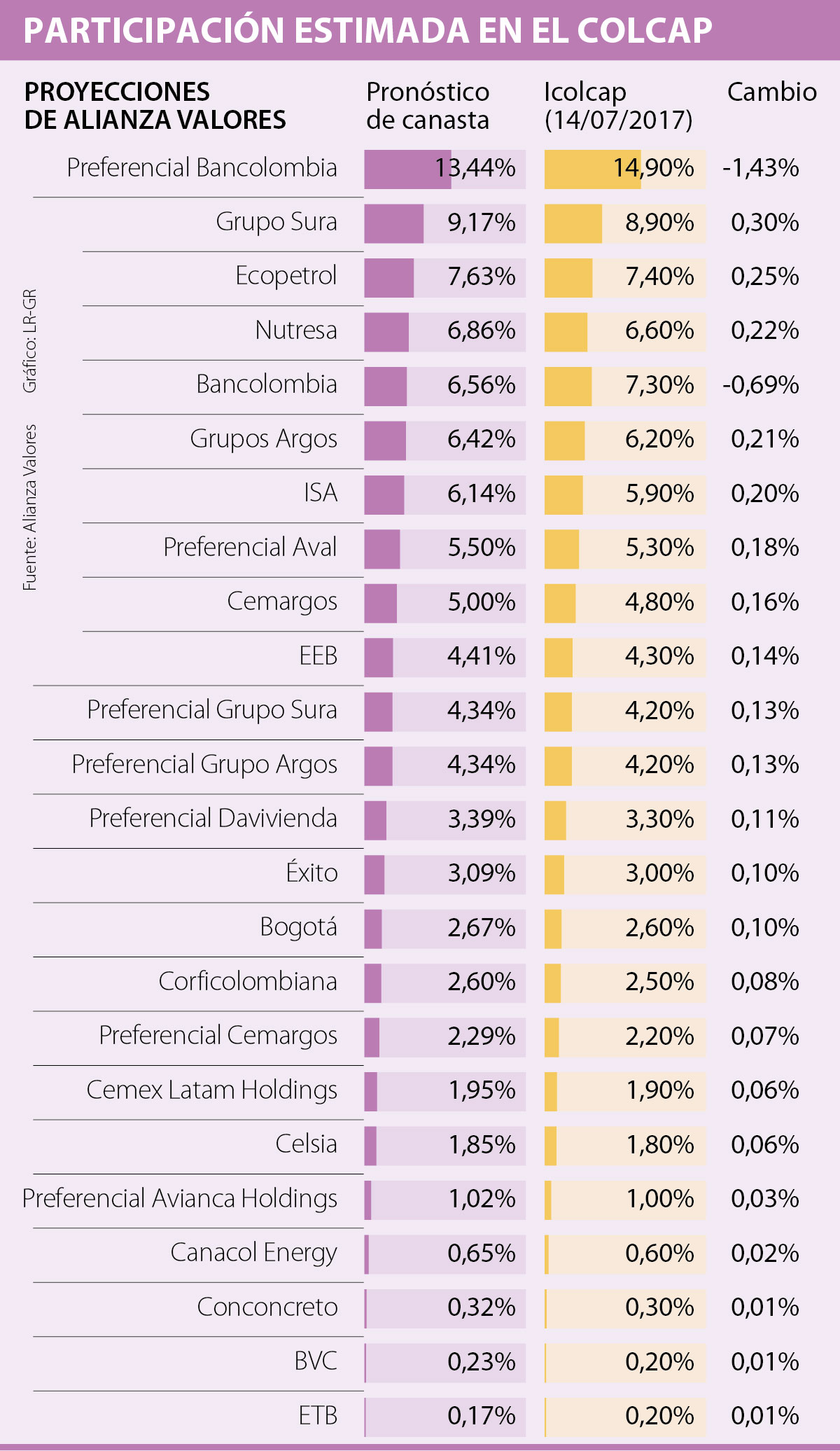 En este sentido, de acuerdo con las estimaciones preliminares de Alianza Valores, la preferencial del banco bajaría 1,43 puntos de una ponderación de 14,90% a 13,44% y, por su parte, la ordinaria descendería su peso en 0,69 puntos al pasar de 7,30% a 6,56%.
