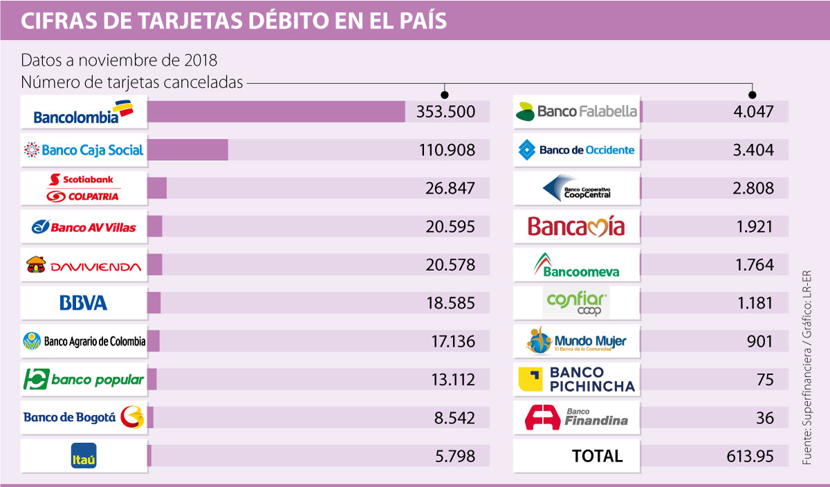 Pero ¿cuáles son los bancos que tienen el mayor número de anulaciones? Bancolombia y Banco Caja Social se llevaron el primer y segundo lugar en noviembre, ya que anularon 353.500 y 110.908 tarjetas de este tipo, respectivamente. Los que los siguieron fueron Scotiabank Colpatria, con 26.847 plásticos anulados, AV Villas (20.595) y Davivienda (20.578).
