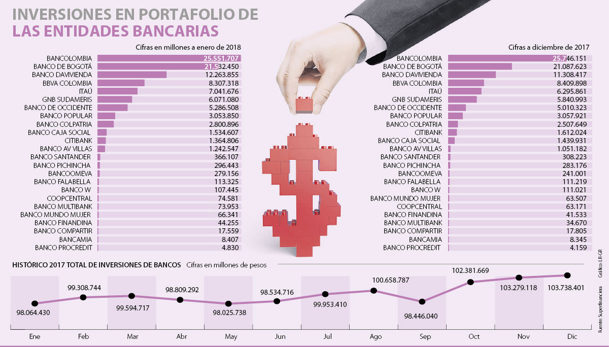 Al hacer la segmentación por las inversiones hechas por cada banco, Bancolombia y Banco de Bogotá se llevan la medalla de oro al reportar inversiones por $25,5 billones y $21,5 billones, respectivamente durante enero de este año. Las entidades también lideraron el ranking durante diciembre de 2017 con inversiones por $25,7 billones y $21,08 billones respectivamente.