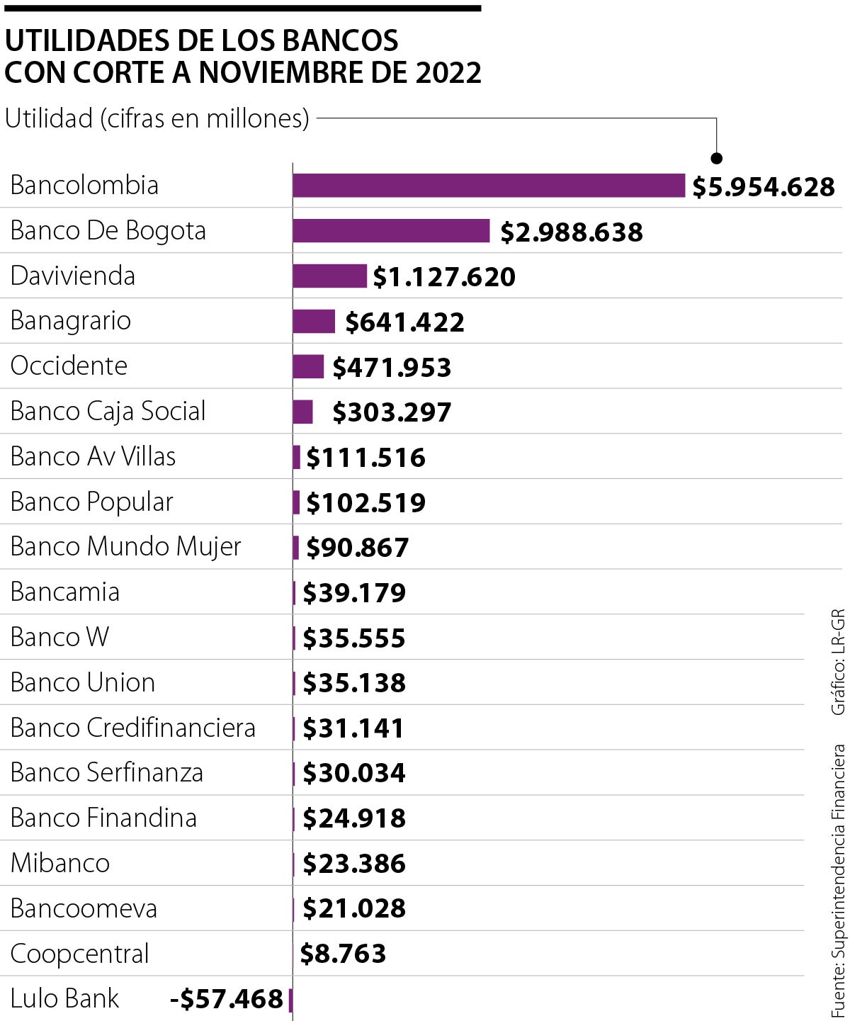 En cuanto a los bancos que lideraron el desempeño, al frente se ubican Bancolombia, con $5,5 billones de utilidades; Banco de Bogotá, con $2,8 billones; y en tercer lugar Davivienda, con utilidades por $1,4 billones a corte de noviembre de 2022. Entre los tres suman utilidades por $9,4 billones.