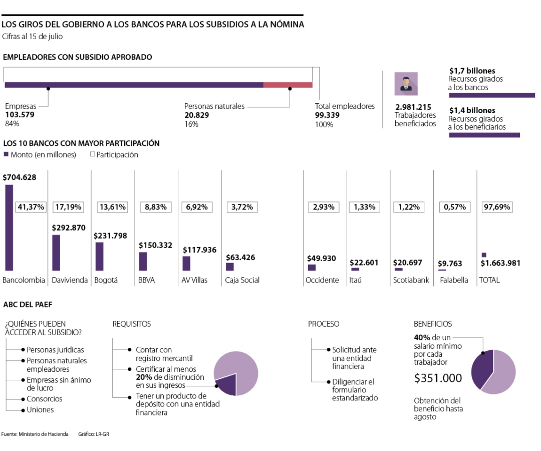 A la primera quincena de julio, el Ministerio de Hacienda confirmó que efectuó giros a 30 entidades del sector financiero que intermedian el pago de estas ayudas estatales por $1,7 billones, de los cuales $1,4 billones ya fueron desembolsados a las cuentas de las empresas o las personas naturales que deben pagar su nómina.