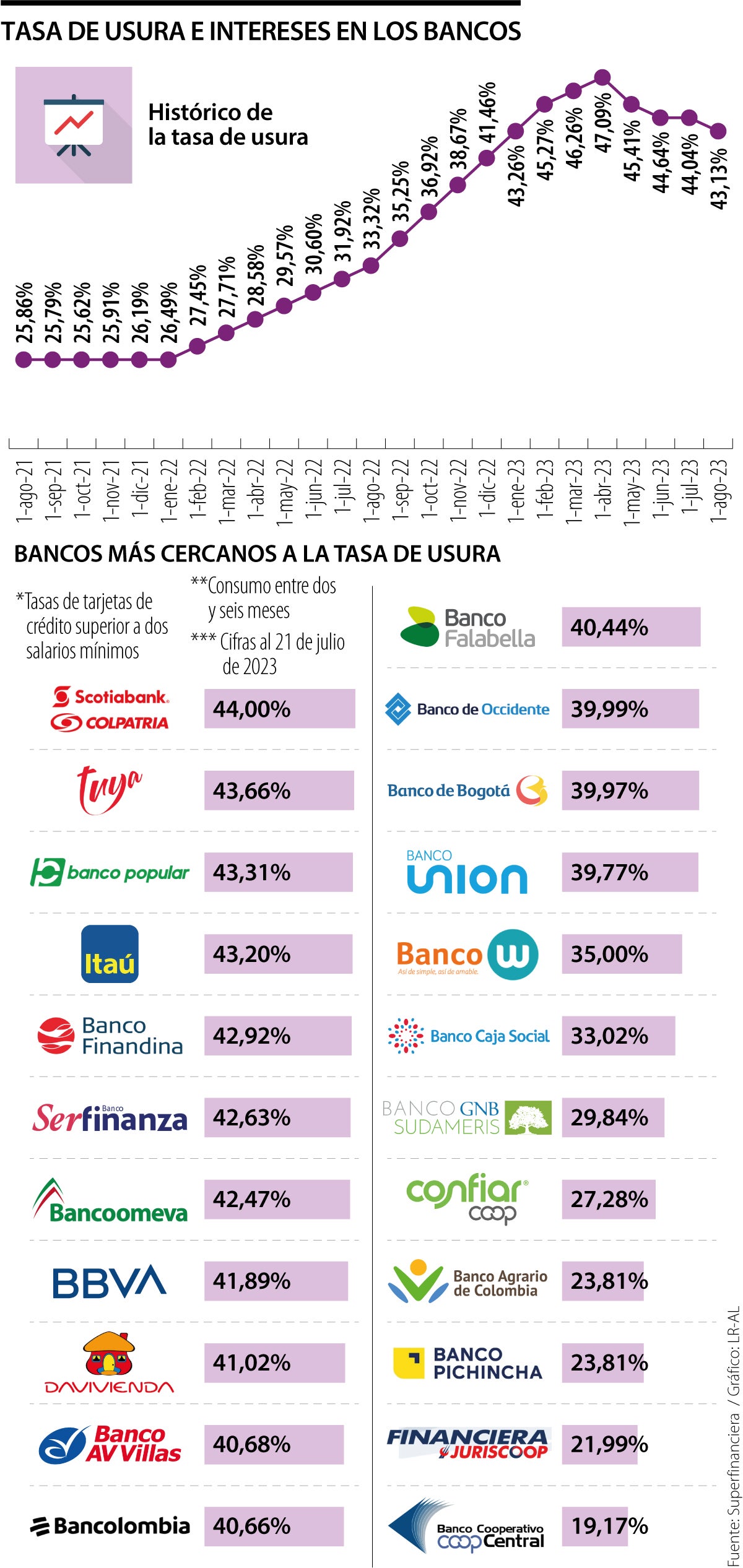 Así entonces, se completaron cuatro meses seguidos en los que el tope a las tasas de interés de tarjetas de crédito se ajustó a la baja. Para agosto, los bancos no podrán cobrarle más de 43,13% si usa esos plásticos; esto representó una caída de 60 puntos básicos respecto a julio.