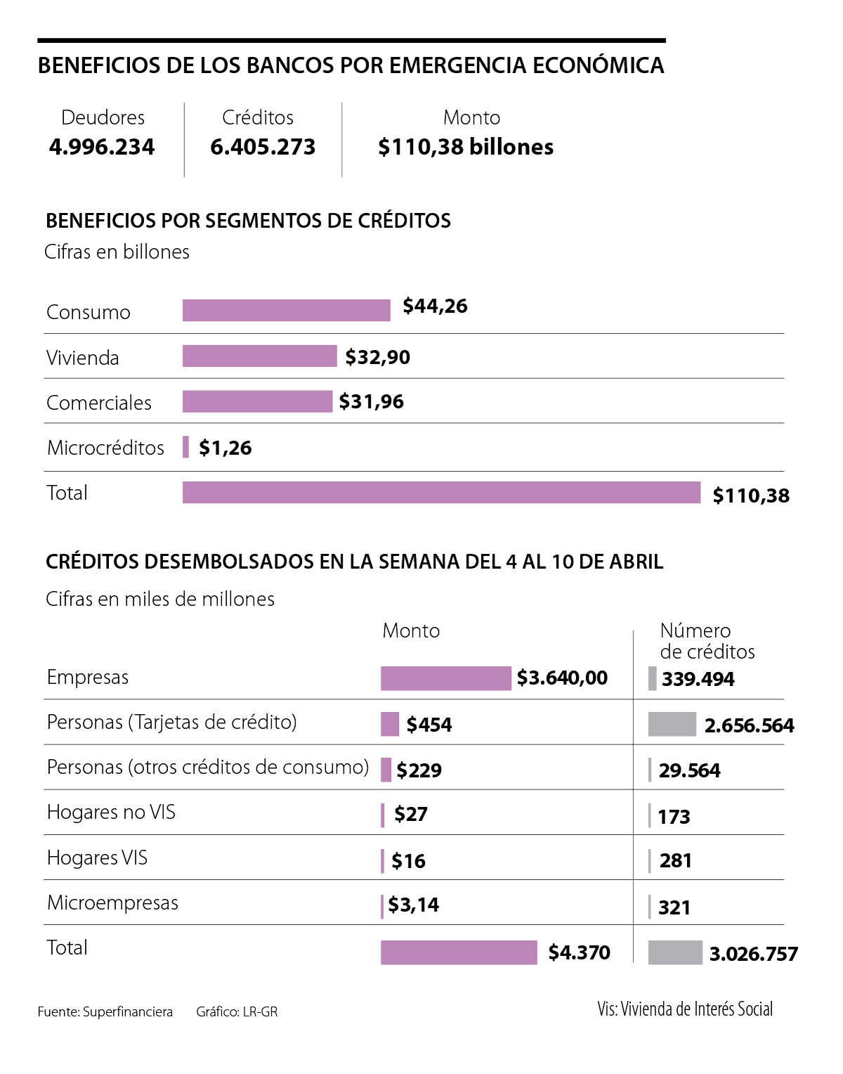 La Superintendencia Financiera informó que, desde el inicio del estado de emergencia en Colombia por la llegada de la pandemia y hasta el 15 de abril, los planes de gracia acumulados del sector financiero han beneficiado a 4,9 millones de deudores (personas naturales y jurídicas), con 6,4 millones de créditos por un saldo de cartera de $110,38 billones.
